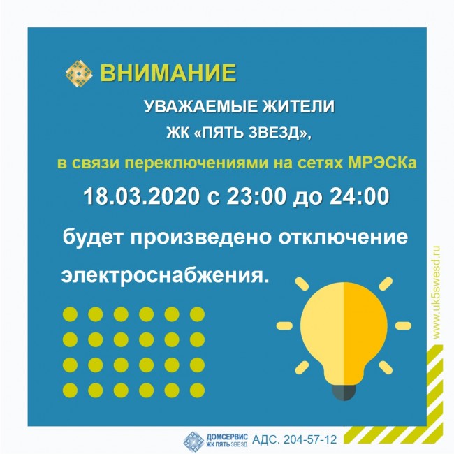 18.03.2020 с 23:00 до 24:00 будет произведено отключение электроснабжения комплекса сотрудниками МРЭСКа в связи переключениями.