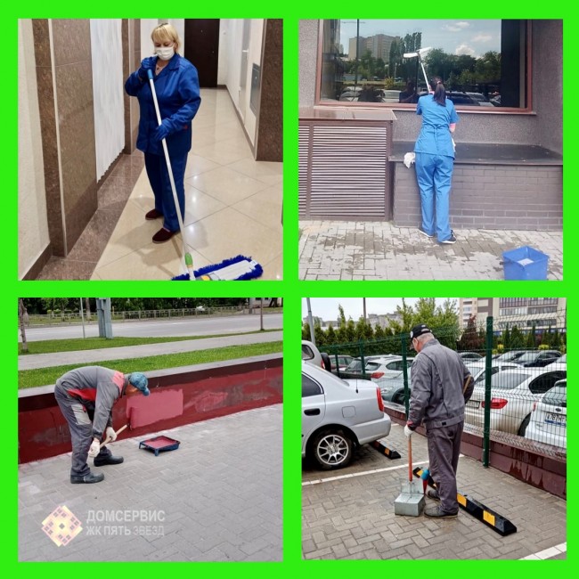 Уборку мест общего пользования по-прежнему производят с использованием дезинфицирующих средств (лифтов, дверей входных групп, ручек и поручней, домофоннных и лифтовых консолей, входов и выходов).Кроме этого, в процессе работ сотрудники управляющей организация «ДомСервис «Пять звезд» используют современную уборочную малую и крупную коммунальную технику, что дает возможность значительно сократить время уборки и повысить ее качество. Клининг территорий производится в любую погоду и в любое время года.