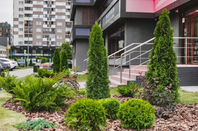 Всего высажено 126 единиц зелёных насаждений: туя Смарагд — 26 ед., туя шаровидная — 25 ед., можжевельник — 60 ед., пузыреплодник — 15 кустов. Теперь у каждого дома полноценные композиции из 15 — 20 ед. растений.